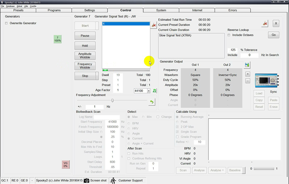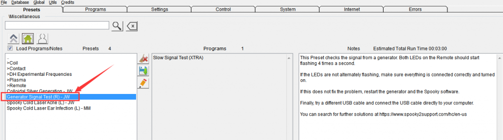 1. Otwórz oprogramowanie Spooky2, kliknij> Miscellaneous Generator Signal Test (R) – JW w zakładce Presets.
