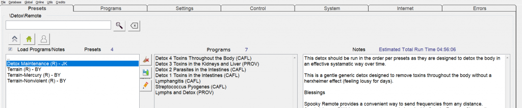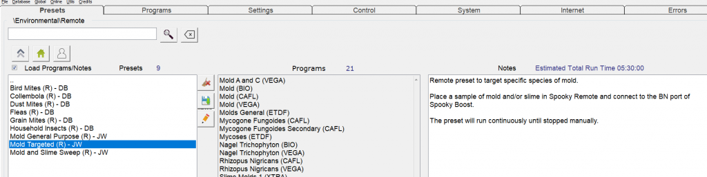 Uruchom oprogramowanie Spooky2, przejdź do zakładki Presets, kliknij>Environmental >Remote i wybierz potrzebne preset zgodnie z Notes po prawej stronie.