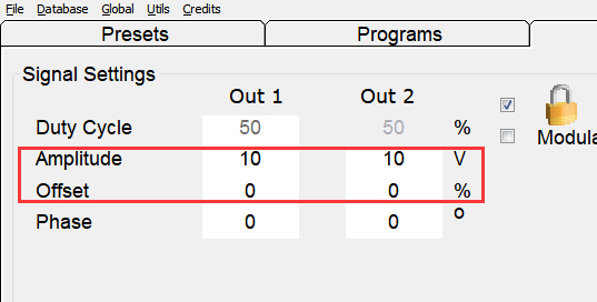 Oba wyjścia są ustawione na 10 V i 0% ofset, ale widać, że „Positive Waveform Only” jest już wybrane. Odpowiada to 5 V przy 100% ofset. Możesz to zobaczyć od kształtu fali:
